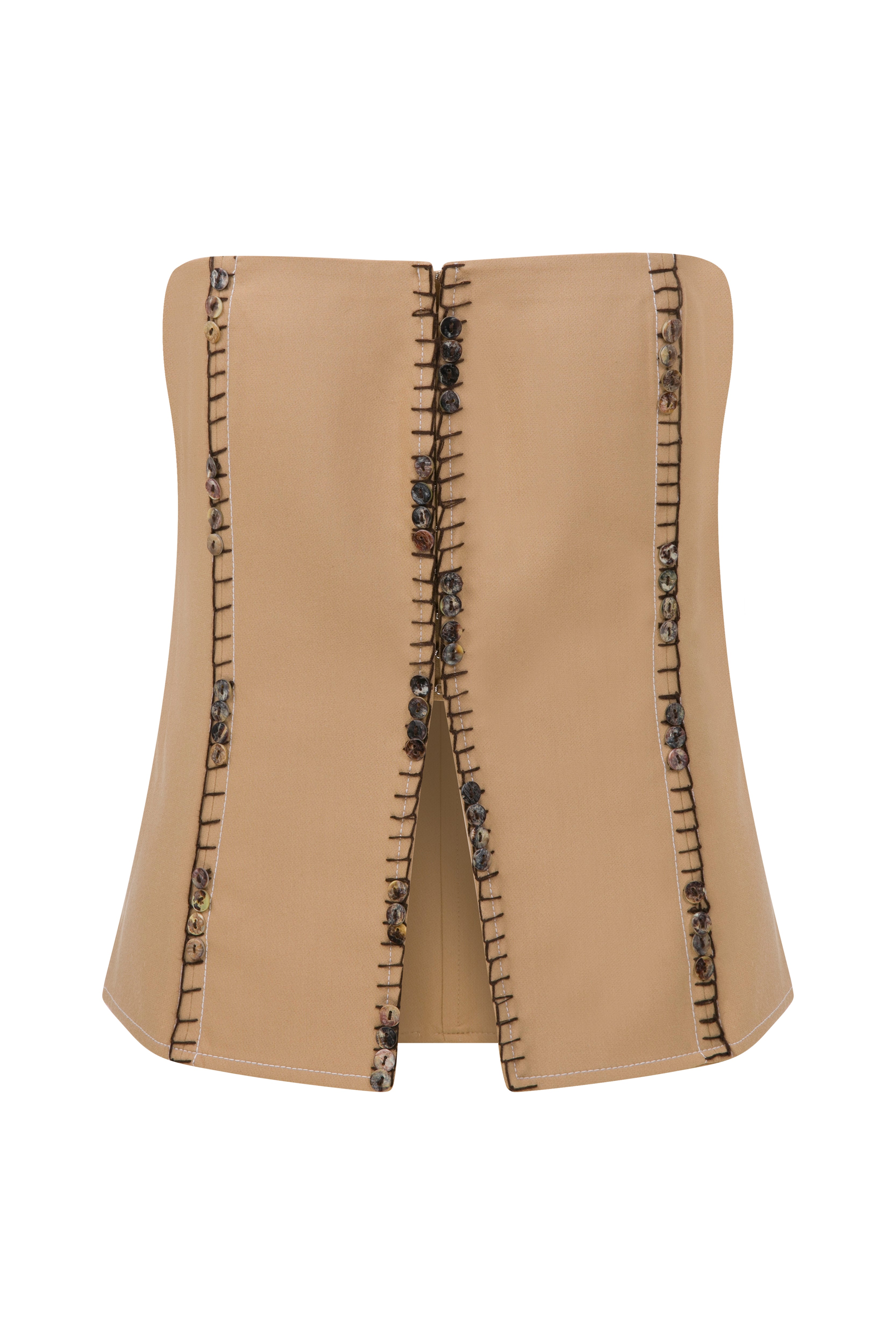 Dua Top, sıcak bej tonunda elastan dokunuşuyla yapılandırılmış polyester-viskon karışımından üretilmiş straplez bir üsttür. Bedeni saran ve destekleyen özel kesimi sayesinde rahat hareket olanağı sunar. Dikey ajur dikiş panelleri ile sedef düğme detayları minimalist silüeti zarif ve özenli bir dokunuşla tamamlar.