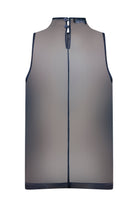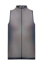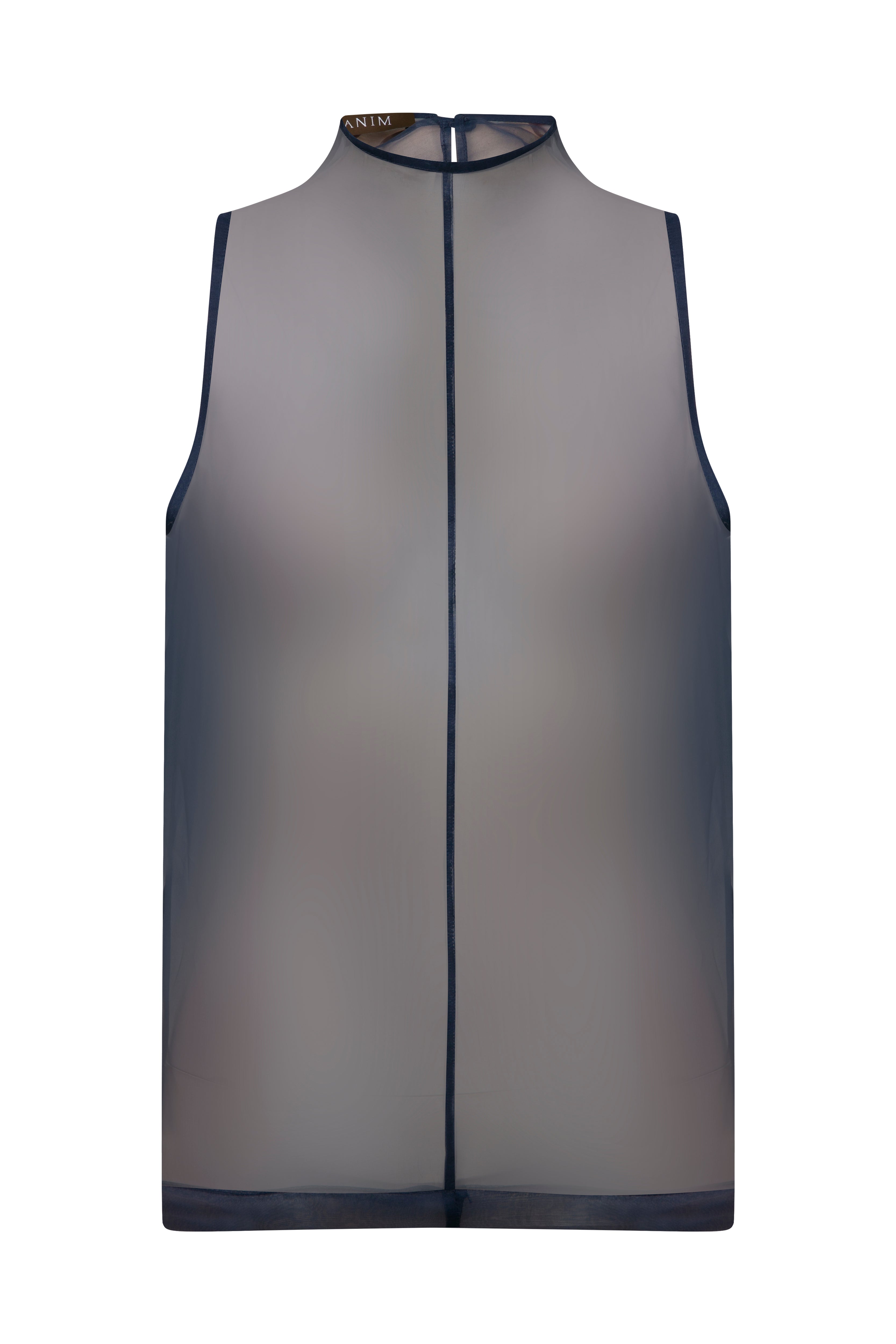 Martin Üst, transparan lacivert organzeden üretilmiş olan kolsuz ve yüksek yakalı bir üsttür. Akışkan kumaşı vücuda hafifçe oturarak havalı ve zarif bir görünüm oluşturur. Minimal tasarımı ve düz kesimi sayesinde braletlerin üzerine, ceketlerin altına veya akşam kombini için tek başına kullanılabilecek çok yönlü bir parçadır.