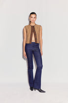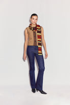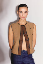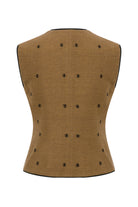 Mera Yelek, bej ve kahverengi ehram kumaştan yapılmış, ince nakışlarla süslenmiş ve kontrast renkli bir düğme patı ile tamamlanmış bir yelektir. Vücuda oturan kesimi beli vurgularken gömlek veya elbiselerin üzerine rahatça katman yapılmasına olanak tanır. Zarif el işçiliğini vurgulayan görünümü sayesinde hem günlük hem de daha şık kombinler için öne çıkan bir parçadır.