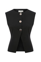 Reka Yelek, klasik siyah renkte, kolsuz bir yelek üsttür. Esneklik için elastan eklenmiş pürüzsüz polyester karışımından üretilmiştir. Belden oturan ve hafif kloş etek ucuna sahip kesimi bedeni şekillendirirken konforu korur. Ön kısımdaki belirgin düğmeler modern bir vurgu katar, gömleklerin üzerine katmanlamak ya da tek başına minimal ve keskin bir görünüm elde etmek için ideal bir parçadır.