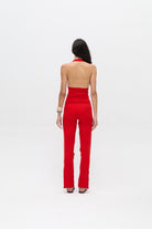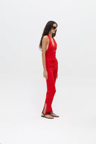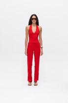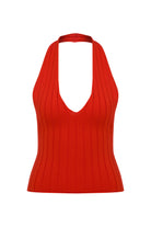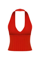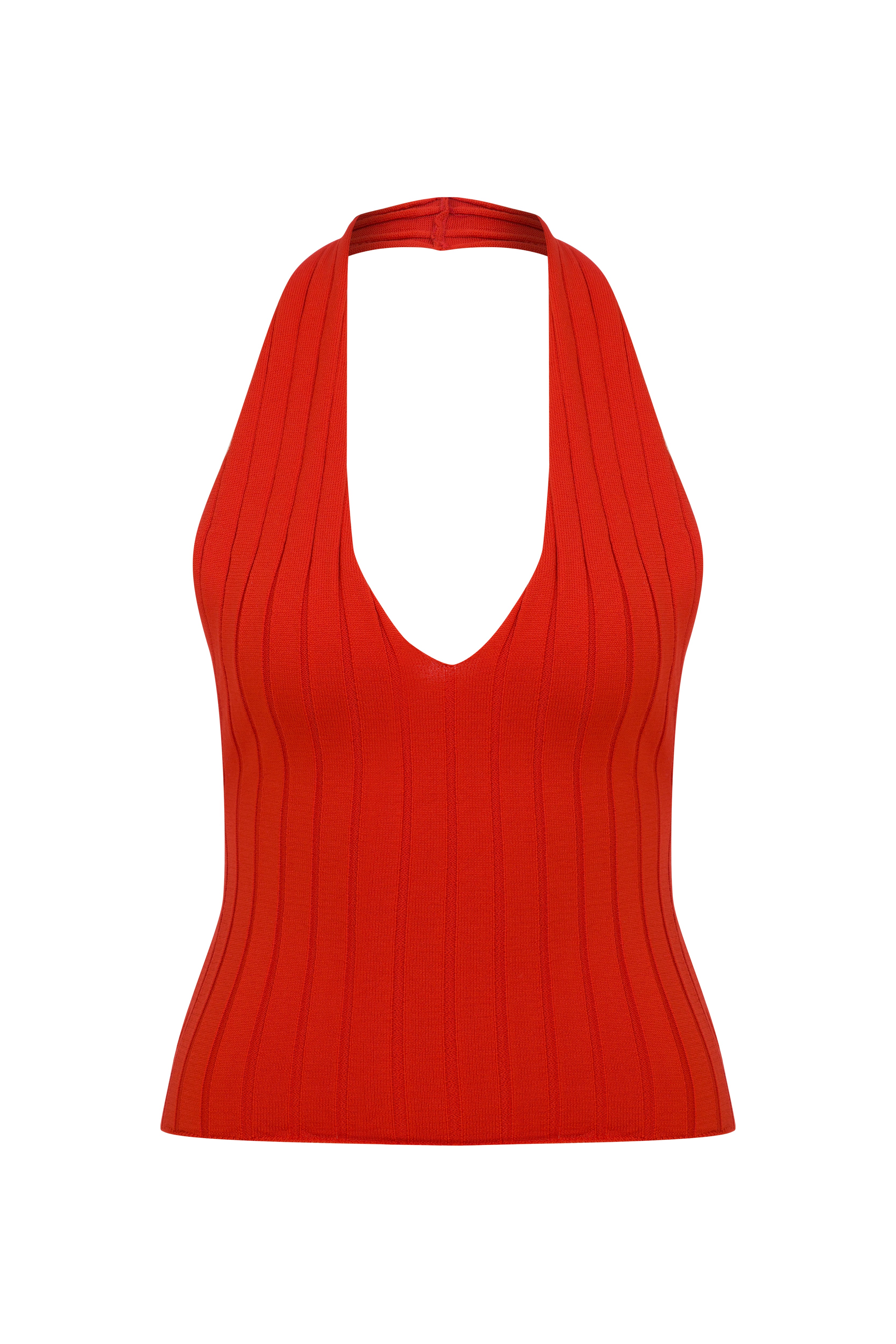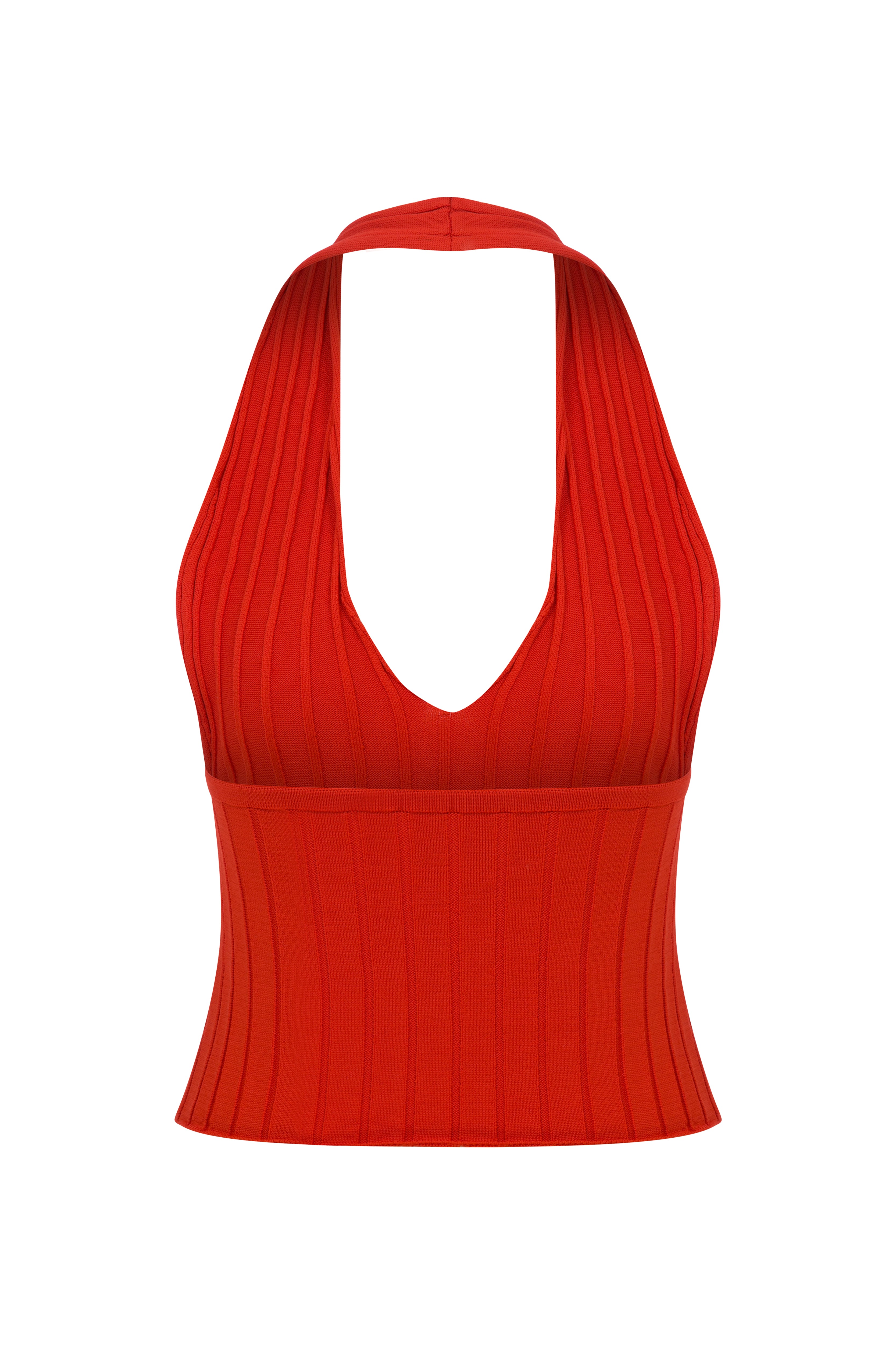 Reni Üst, canlı kırmızı renkte örme kumaştan üretilmiştir. Halter yaka tasarımı omuzları vurgularken, sade ve modern çizgileriyle dikkat çeker. Esnek yapısı bedene uyum sağlayarak rahat hareket imkânı sunar. Pürüzsüz formu ve esnek dokusu sayesinde hem takım parçalarla hem de farklı dokularla kombinlenerek dinamik bir görünüm oluşturur.