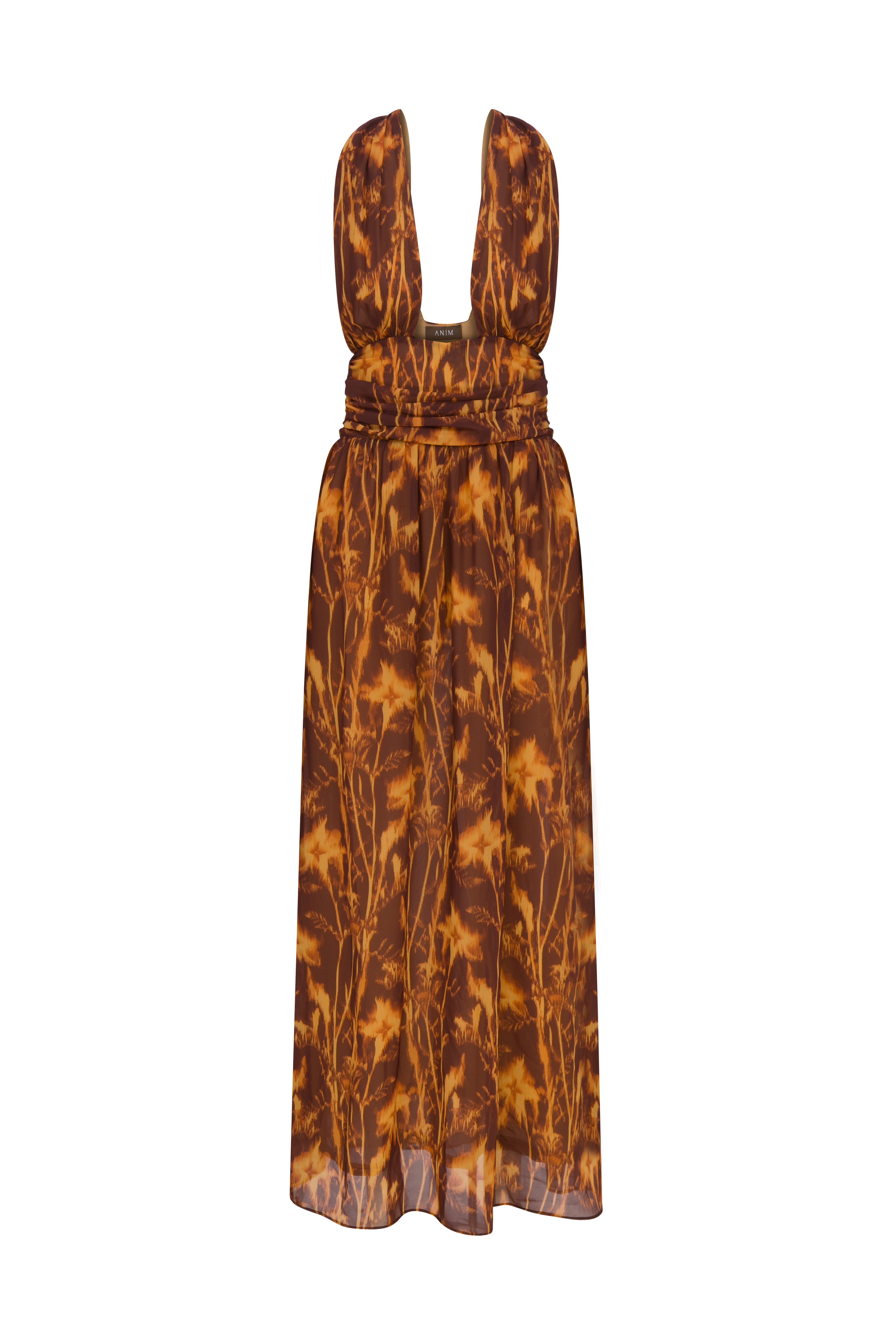 Sola Elbise, desenli şifon kumaştan üretilmiş, kolsuz bir modeldir. Geniş askıları ve bel kısmındaki büzgü detayıyla uzun, rahat bir siluet sunar. İnce ve dökümlü yapısıyla zamansız bir görünüme sahiptir; her stile uyum sağlayan sade ama etkileyici bir parçadır.