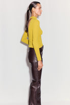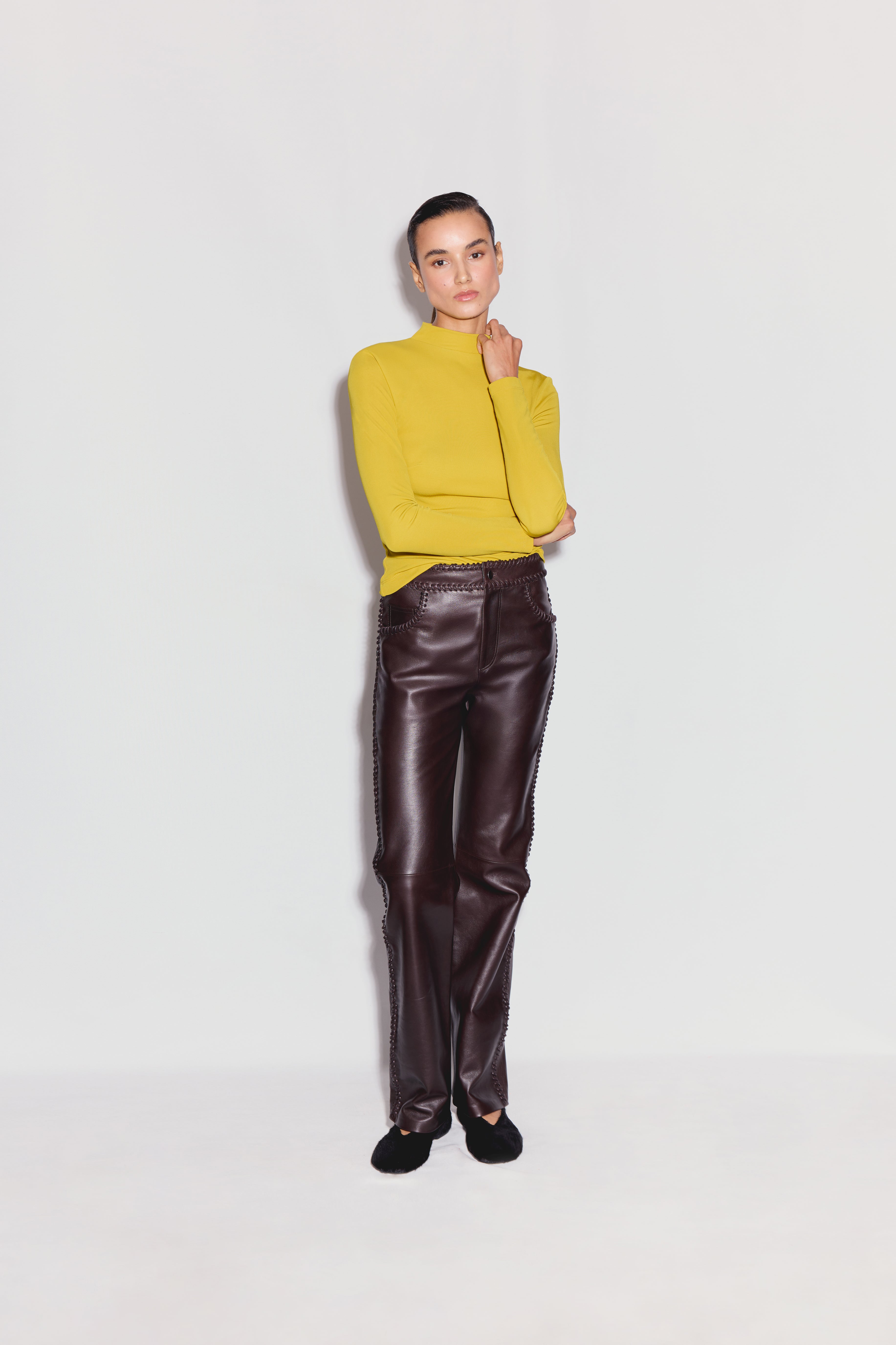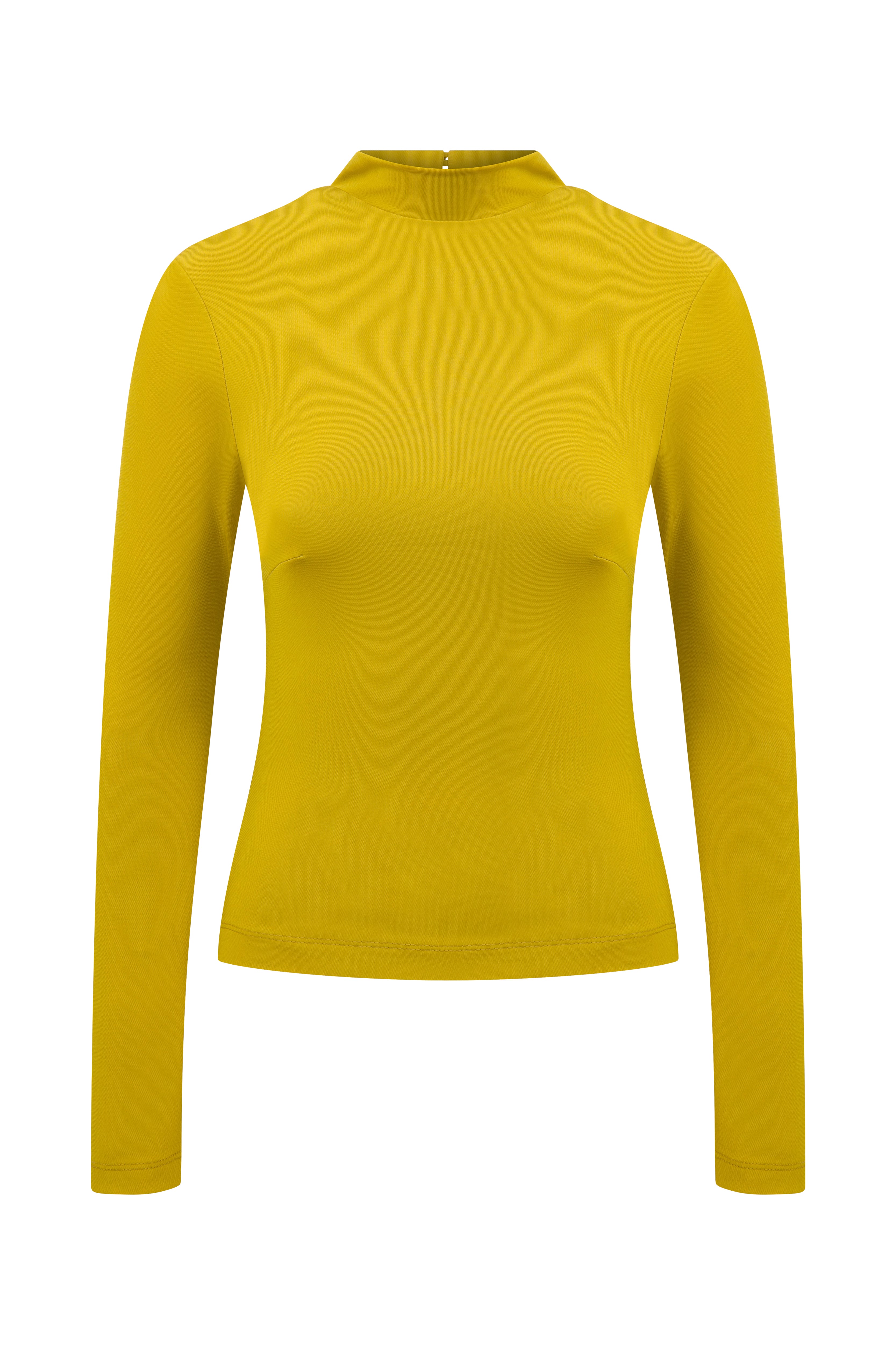 Wade Üst, sezonun sıcak tonlarından biri olan zengin hardal renginde, yüksek yakalı ve uzun kollu bir üsttür. Yumuşak viskozdan üretilmiş olup, vücudun doğal hatlarını kısıtlayıcı bir his yaratmadan nazikçe takip eder. Dar kesimi sayesinde şık ve sade bir siluet sunar; tek başına giyilebileceği gibi pek çok farklı stil de uyum sağlar.