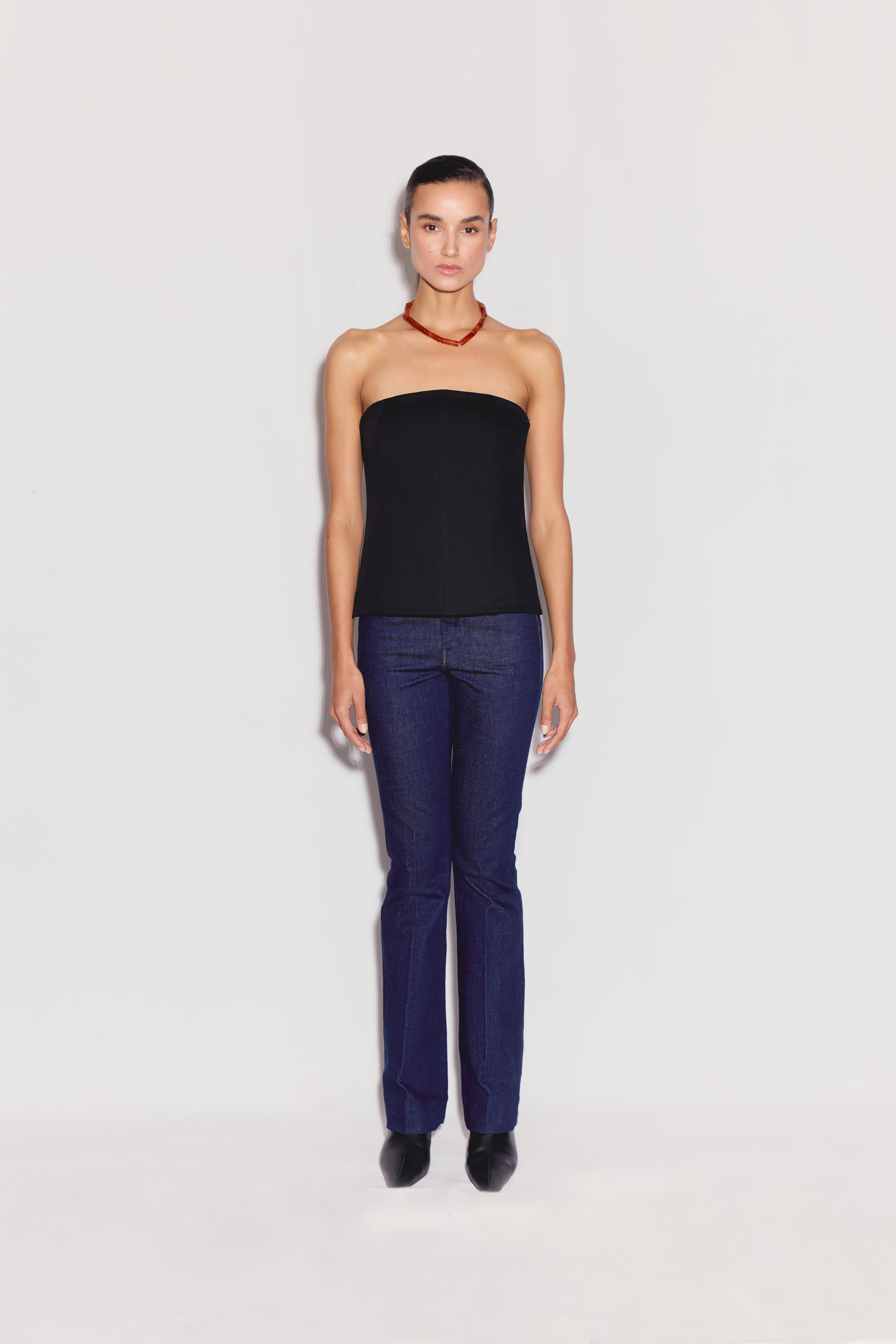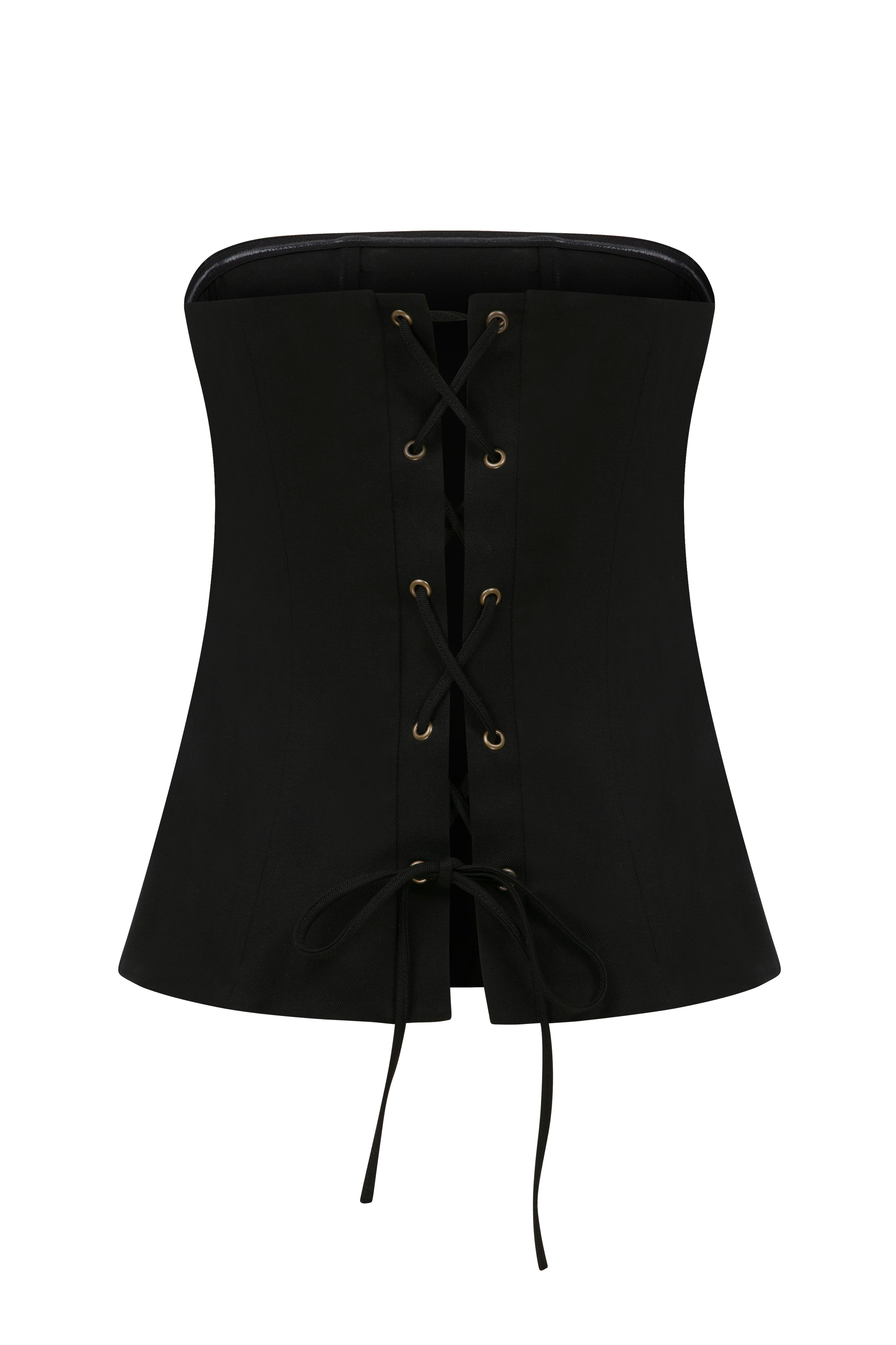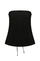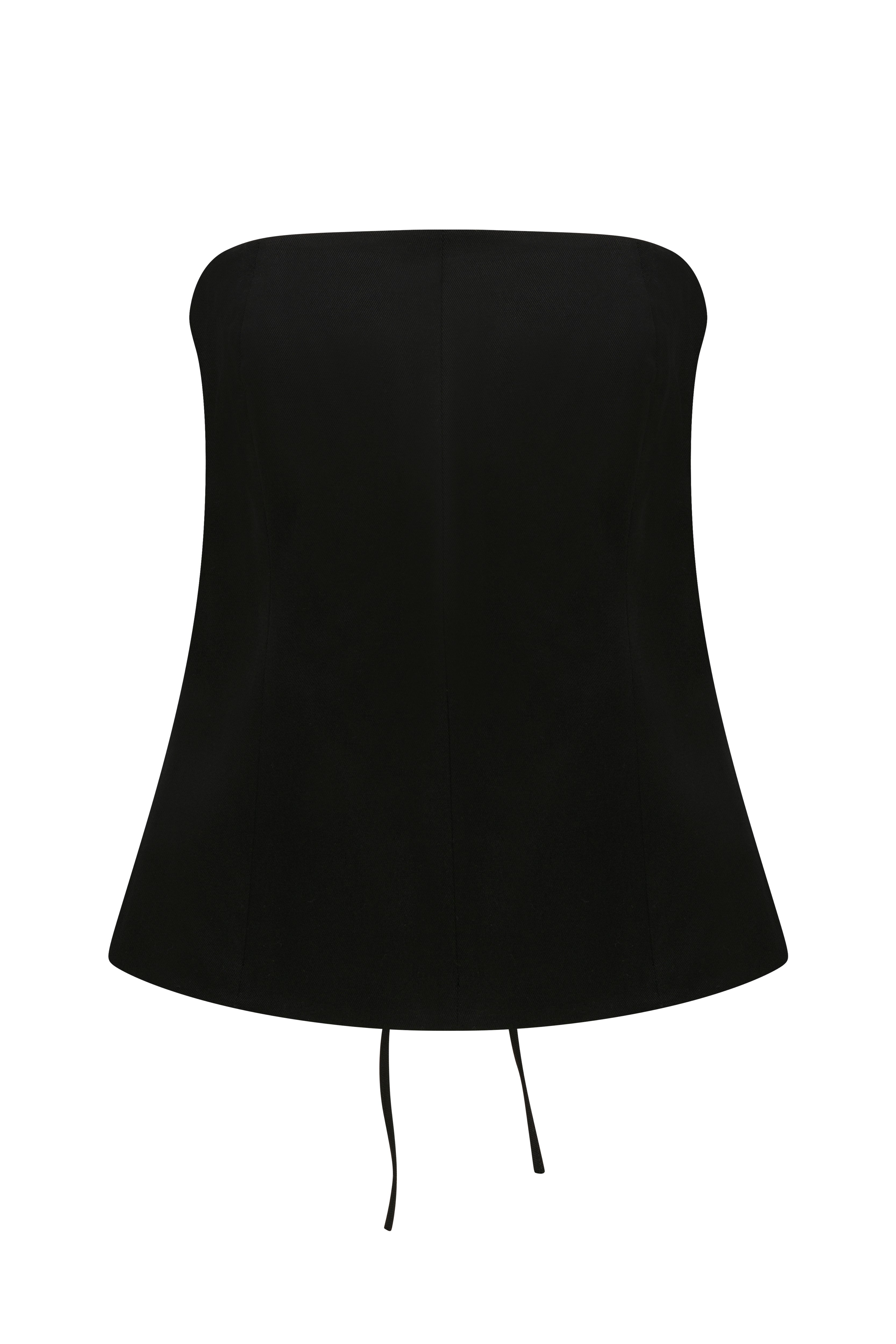 The Marlo Top is a black strapless top featuring delicate tie details at the back. Crafted from a structured cotton blend with slight stretch, it offers a close, supportive fit while allowing comfortable movement. Its clean, minimal front contrasts with the playful tie-back design, adding a subtle statement element that works seamlessly from day to night.