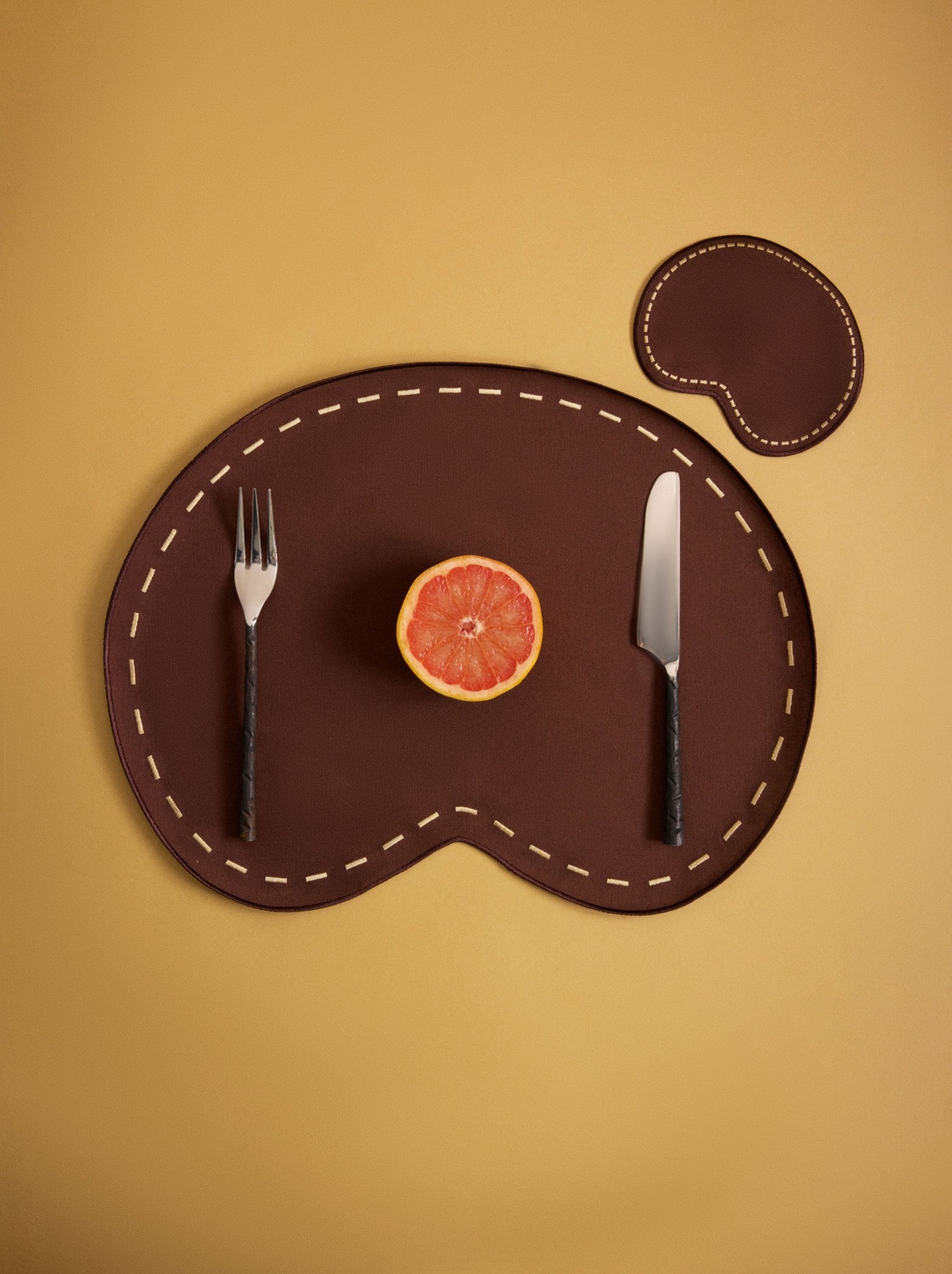 Bean Amerikan Servis, yumuşak hatlara sahip fasulye formuyla sofralara sıcak bir dokunuş getirir. Kahverengi pamuk karışımlı kumaşı ve beyaz dikiş detayları, sade ama dikkat çekici bir kontrast oluşturur. Yalnızca tabakların altına serilen bir parça değil, aynı zamanda sofraya derinlik ve karakter katan bir detaydır.